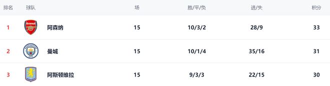 随着这一轮曼城大胜桑德兰,阿森纳输给阿斯顿维拉,导致英超争冠形势大变。曼城总积分达到31分,排名第2,只比榜首的阿森纳少2分。而第3名的维拉也只比阿森纳少3分。